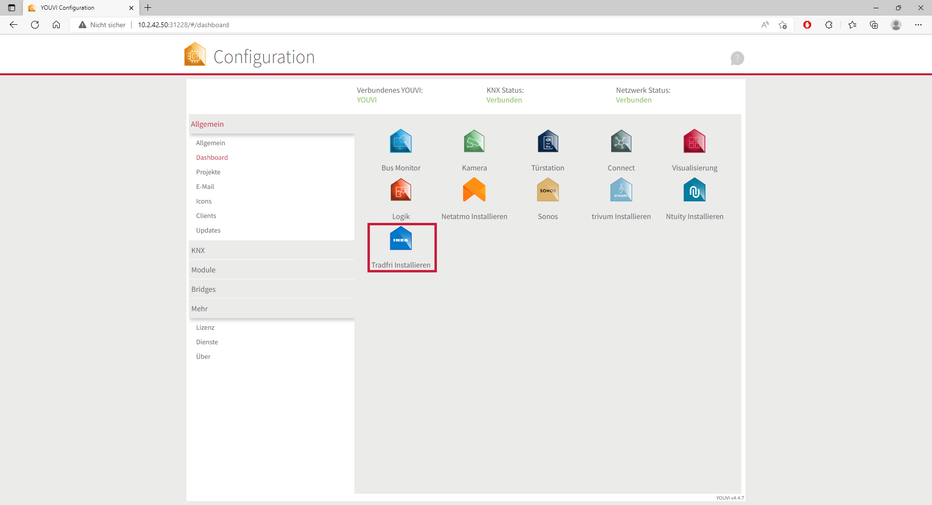 - Sofern das gewünschte Add-On noch nicht installiert ist, holen Sie dies über YOUVI Dashboard nach. Dazu klicken Sie im Falle der IKEA-Tradfri-Bridge auf „Tradfri installieren“.