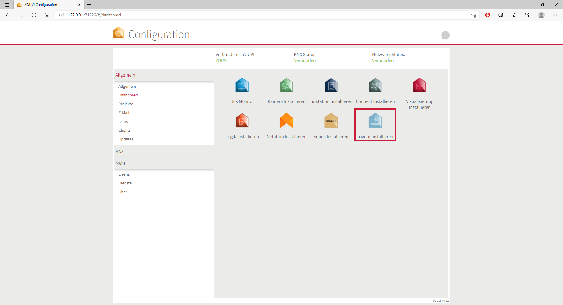 - Sofern das gewünschte Add-On noch nicht installiert ist, holen Sie dies über YOUVI Dashboard nach. Dazu klicken Sie im Falle der trivum-Bridge auf „trivum installieren“.